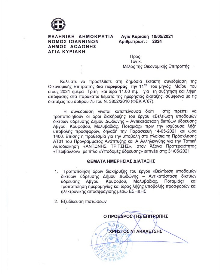 Πρόσκληση έκτακτης οικονομικής επιτροπής στις 11-05-2021